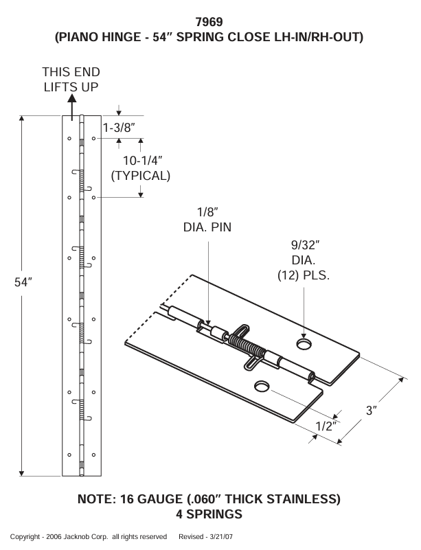 PIANO HINGE 3"W X 54"L, 7969- 1/8" PIN -4 SPRINGS (LH-IN/RH-OUT)-LIFT STAINLESS,(16 Gauge)